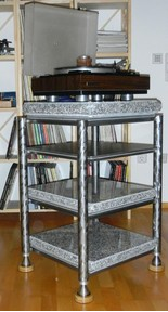 This rack contains 4 shelves, 3 with granit-boards, edges irregular - broken from hand. 1 shelve made from stainless steel and every shelve has a plate of plexiglas for LED-lighting.
